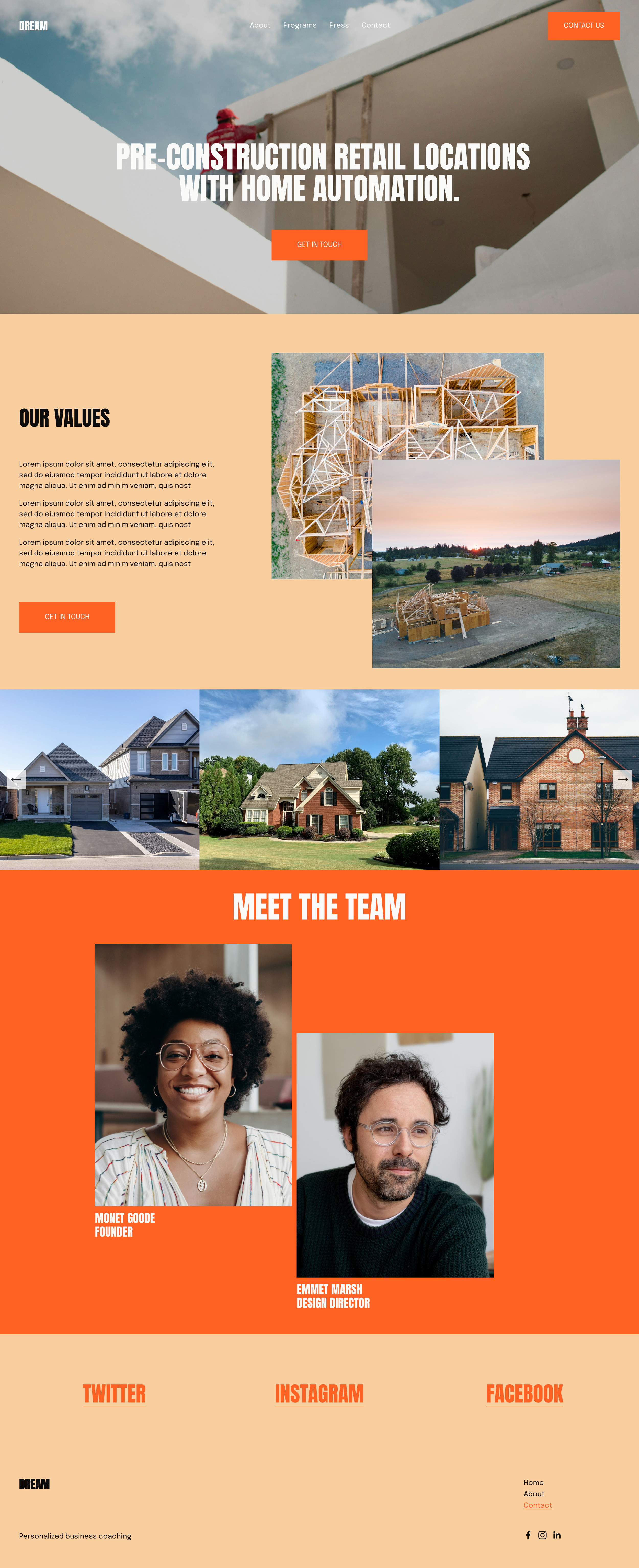 Dreams is a playful concept brand offering smart pre-construction spaces for young adults. I designed a welcoming website with a nostalgic look and feel, clear product info, and gentle prompts to connect on social media — all wrapped in the brand’s bold orange personality.
